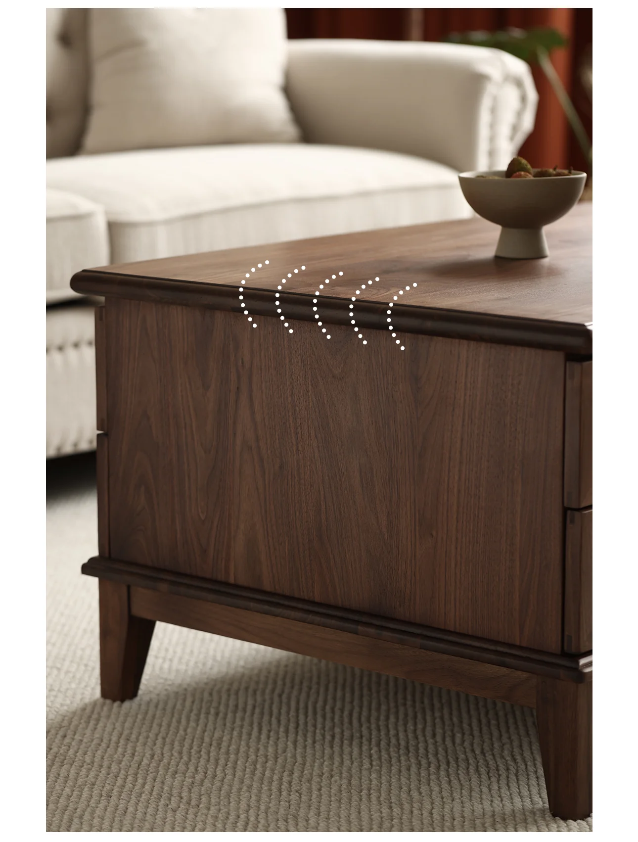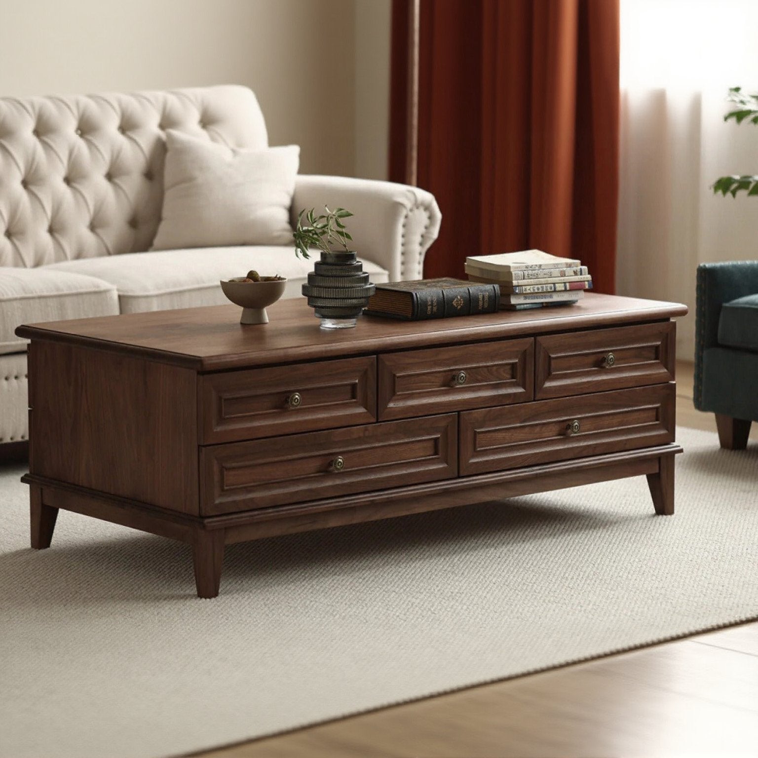 Představujeme Americký konferenční stolek z černého ořechového dřeva s více zásuvkami, stylový a funkční ústřední prvek vašeho obývacího pokoje. Tento konferenční stolek, vyrobený z vysoce kvalitního černého ořechového dřeva, kombinuje eleganci s praktičností a nabízí dostatek úložného prostoru a úžasný design.