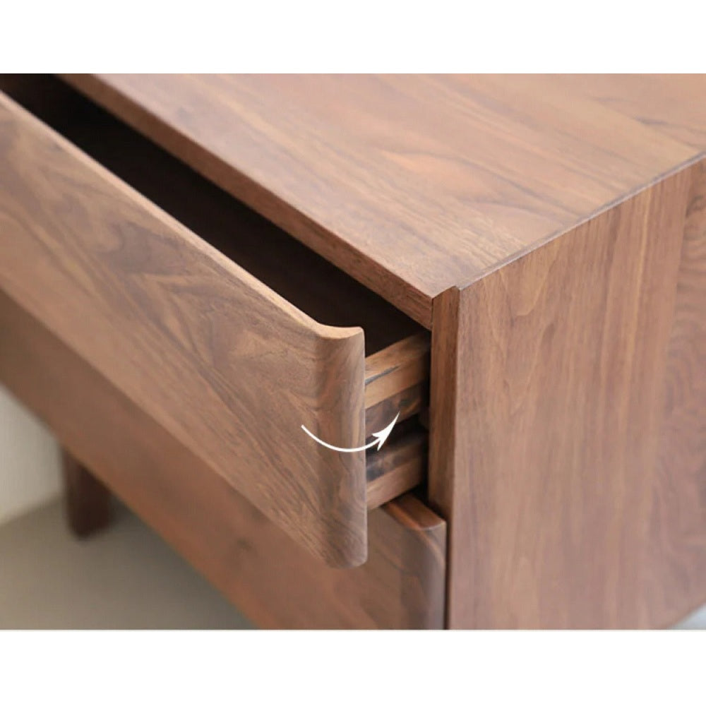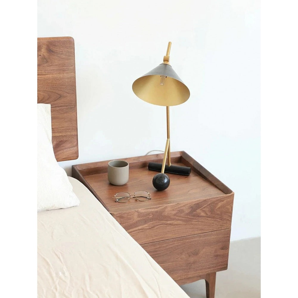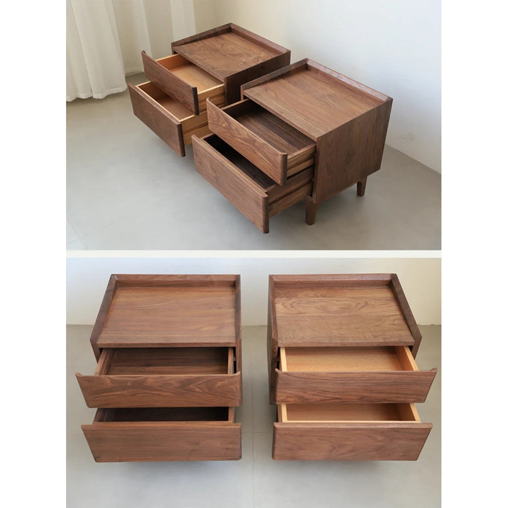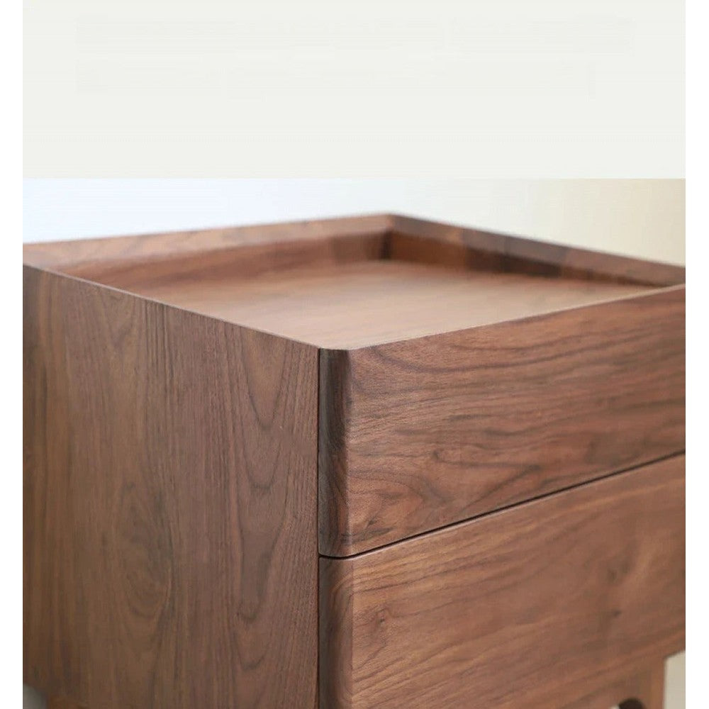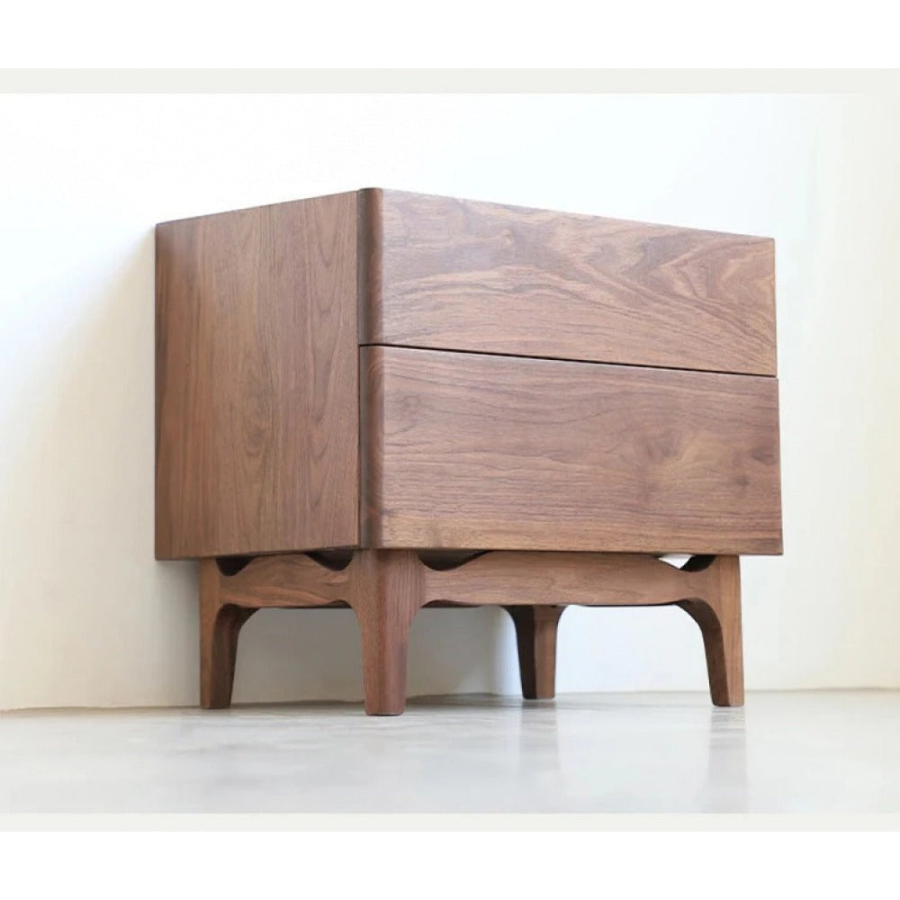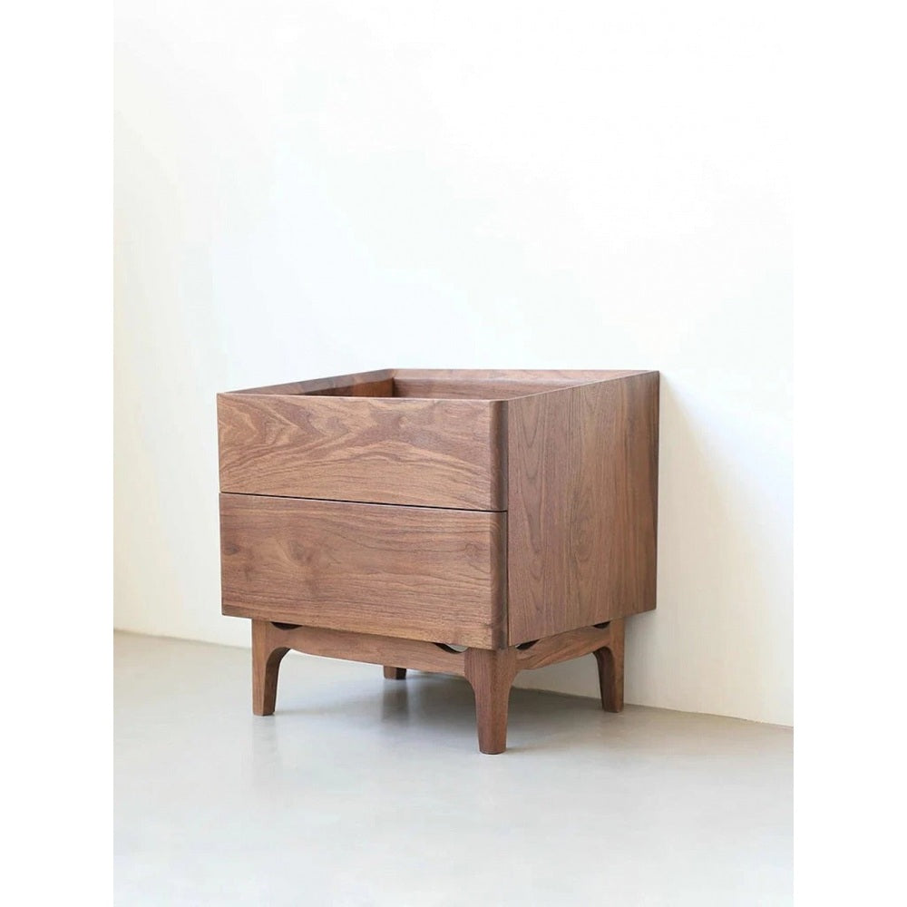 Die geschwungenen Beine und weichen Kanten des Tisches sorgen für eine markante, fließende Silhouette. Eine minimalistische Schublade oder ein Fach mit Fensterläden bietet praktische Aufbewahrung am Bett, wobei sich leicht zu öffnende Griffe in das Design einfügen. Der Glanz des Walnussholzes bleibt durch eine von Hand aufgetragene Oberfläche erhalten, was die Haltbarkeit gewährleistet und gleichzeitig seine natürliche Schönheit verstärkt. Dieser Nachttisch ist ideal für Innenräume, die Wert auf natürliche Materialien, dezenten Luxus und ruhige, zusammenhängende Räume legen.