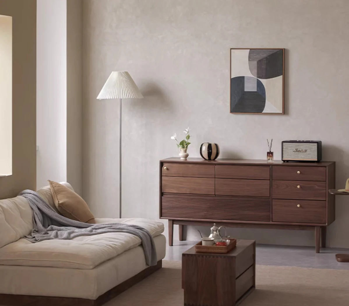 Made from high-quality black walnut, this sideboard showcases rich colors and beautiful grain patterns, ensuring durability and timeless appeal.